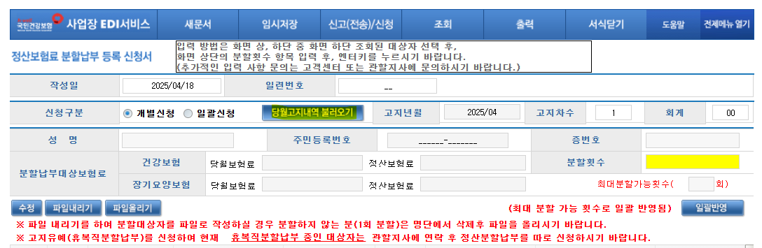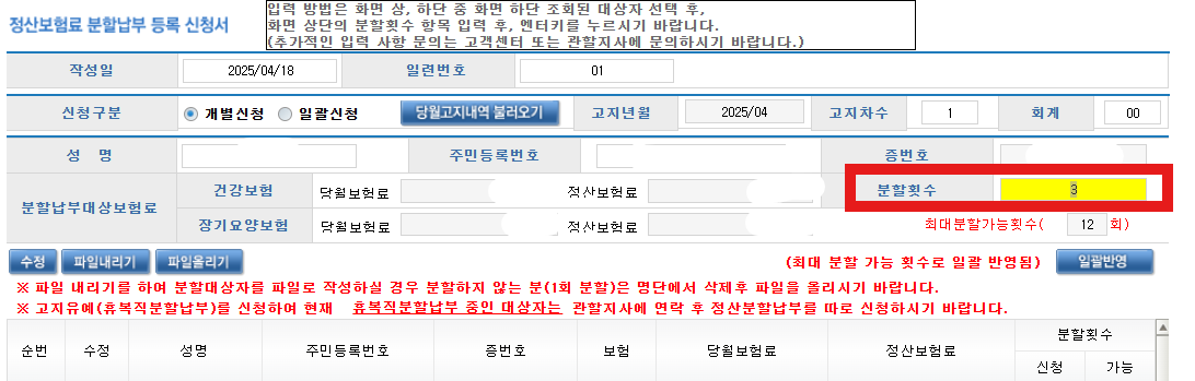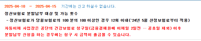 2025-04-10 ~ 2025-04-15 이 기간동안에는 정산보험료 분할납부를 신청할 수 없었습니다.