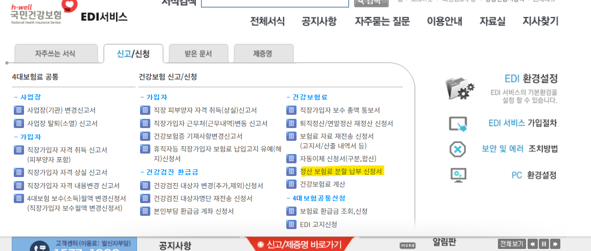 3. 신고/신청> 정산보험료 분할납부 신청서