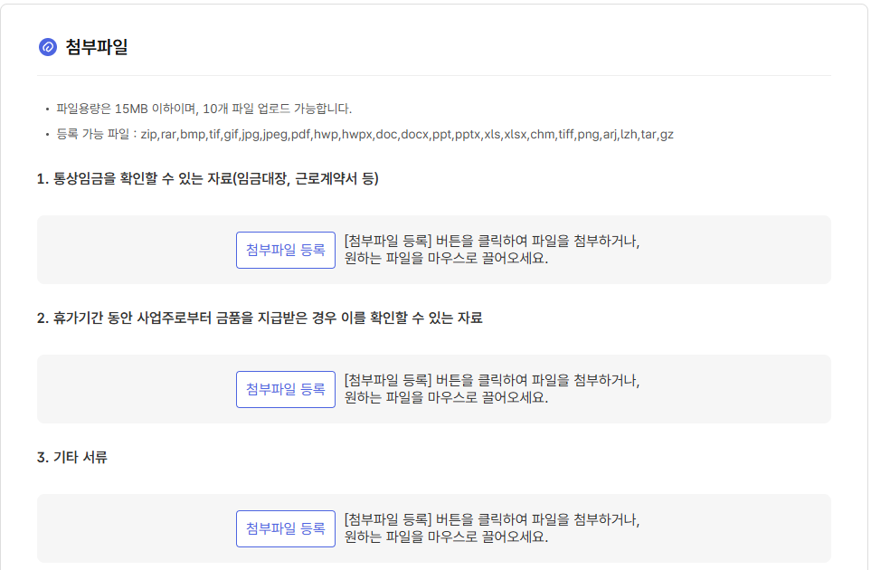 준비해둔 최근 3개월치 급여명세서를 하나로 합친 PDF파일을 1번 통상임금을 확인할수 있는 자료에 첨부파일 등록을 누르고 파일 업로드 해줍니다. 2번부터 5번, 나머지 기타 서류들은 해당되지 않으면 첨부하지 않아도 되기 때문에 저는 1번만 업로드 했습니다.