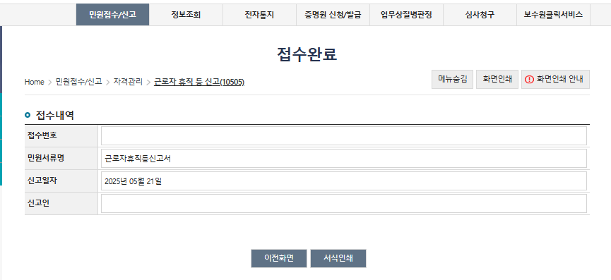 접수완료 되었습니다. 서식인쇄를 누르면 [ 근로자 휴직 등 신고서 ] 를 출력할 수 있습니다.