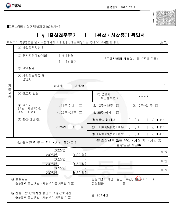 신고서 출력을 누르면 나오는 출산전후휴가 확인서 입니다.