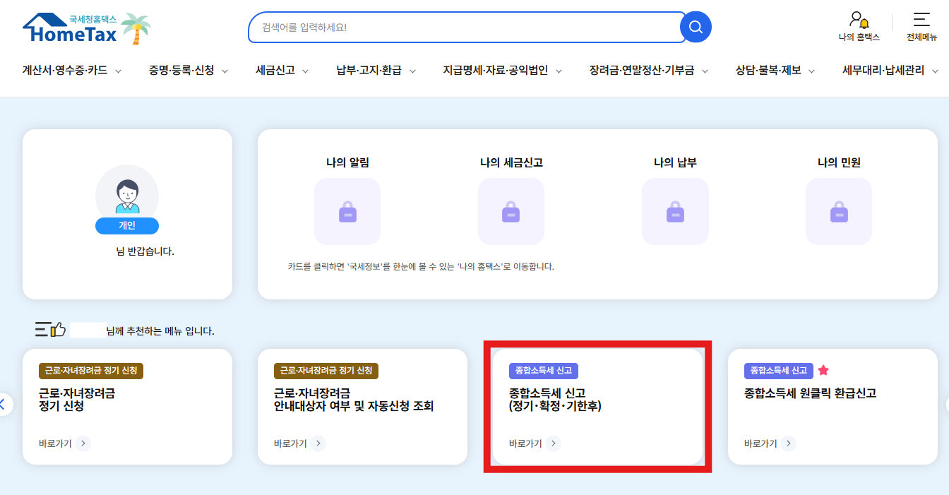 그리고 종합소득세 신고 메뉴를 클릭합니다.