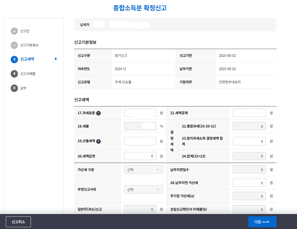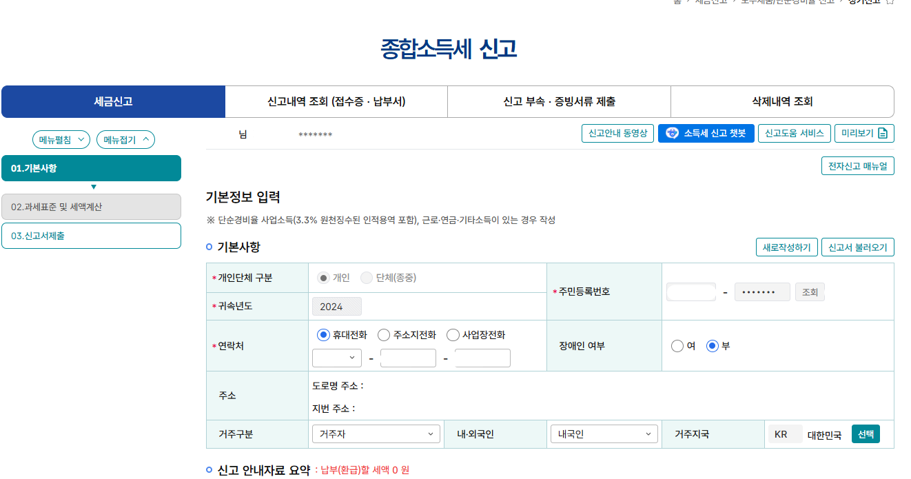 4. 종합소득세 신고 화면으로 전환됩니다.