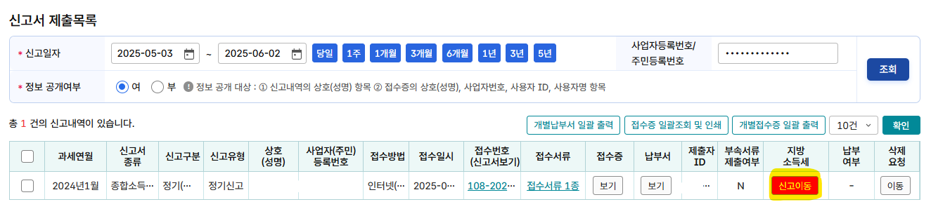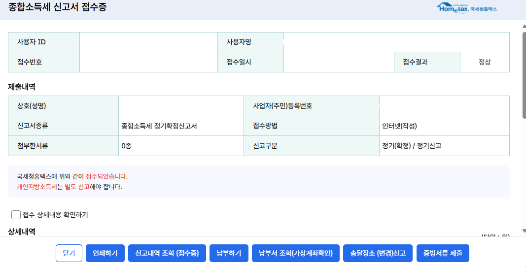 종합소득세 신고 > 신고내역 조회로 가면 방금 신고한 신고내역을 볼 수 있습니다.