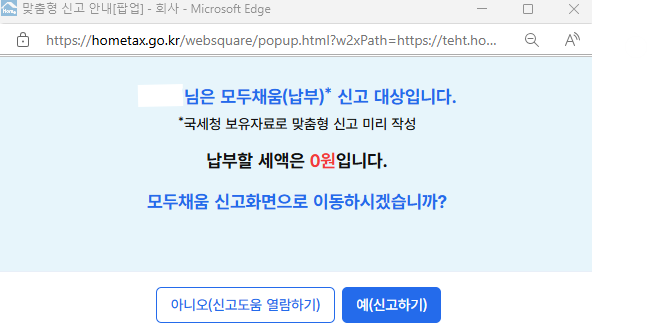 3. 들어가면 아래처럼 팝업이 뜰것입니다. 저는 모두채움(납부) 신고대상이라길래 예(신고하기)를 눌러 신고하였습니다.