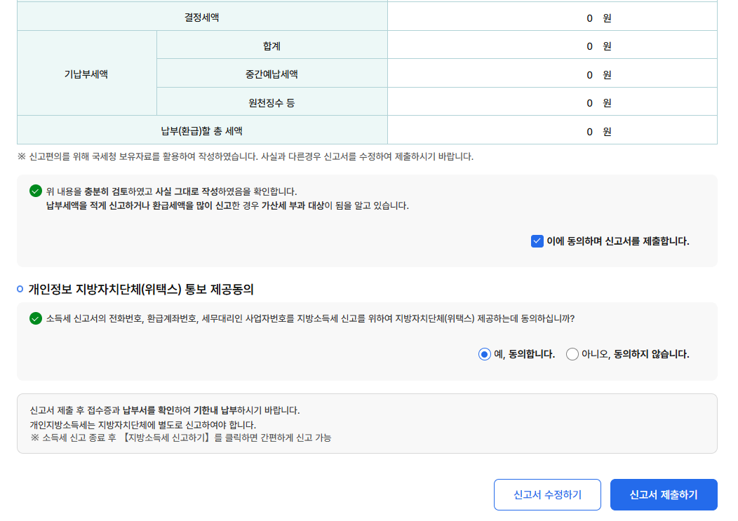 동의합니다 클릭하고 제출눌러주면 종합소득분 지방소득세 확정신고도 끝입니다.