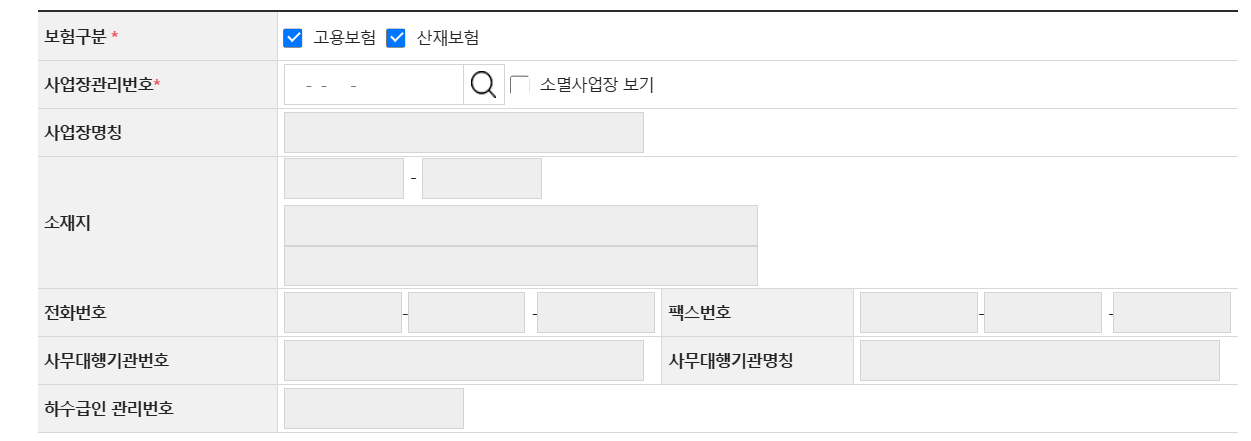 3. 고용보험, 산재보험 체크해주고 사업장관리번호를 조회하면 사업장 정보가 자동으로 입력됩니다.