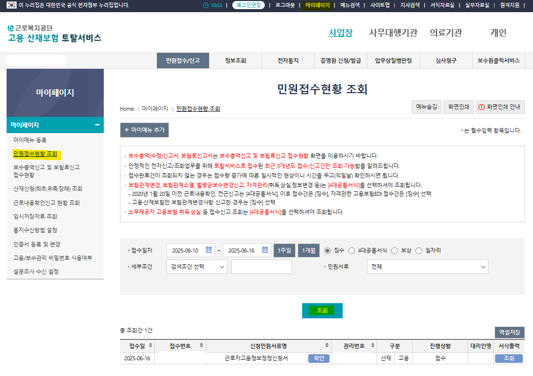 [마이페이지 > 민원접수현황 조회 > 조회 ]