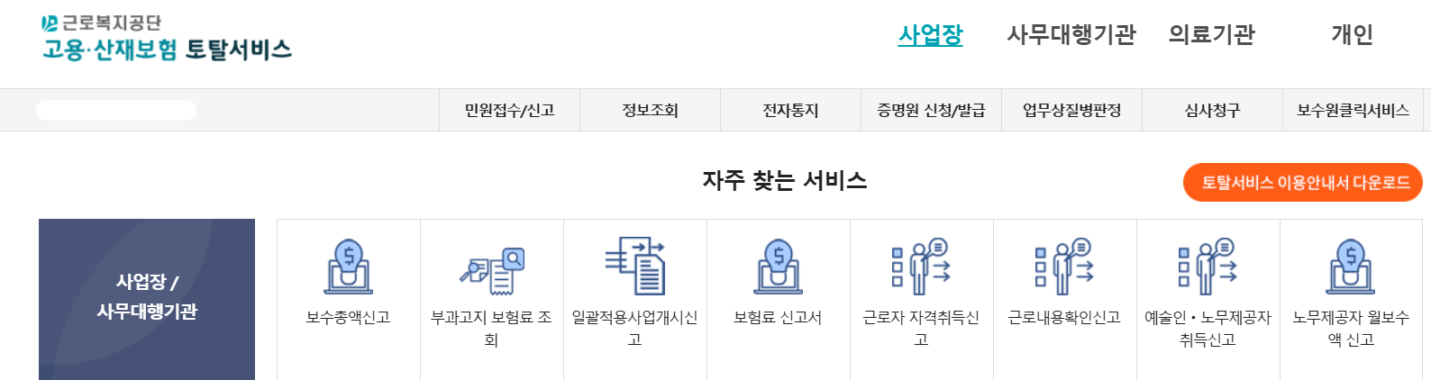 1. 우선 고용산재 토탈서비스 사이트로 들어가서 사업장 공동인증서로 로그인 해줍니다.