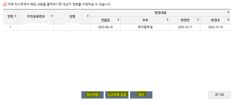 4. 아래 리스트에서 대상자 추가가 되었으면 정보를 확인하신 후 [ 임시저장 > 신고자료 검증 > 접수 ] 를 눌러줍니다.