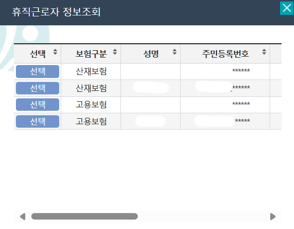 2. 위에 휴직 시작일 변경할때와 마찬가지로 사업장 관리번호 조회를 하면 사업장 정보가 조회됩니다.