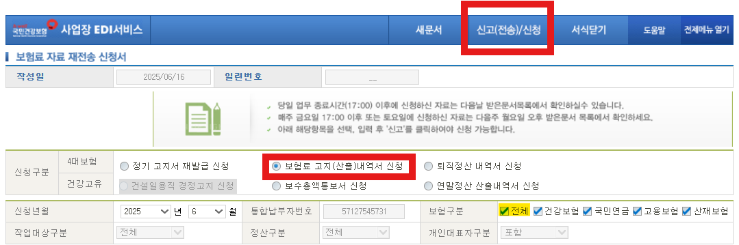 메인화면에 보낸문서에서 보험료 자료 재전송 신청서 (보험료 고지(산출)내역서 신청)을 신고한 내역을 확인하실 수 있습니다.