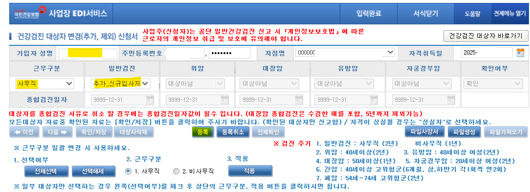 그러면 다시 아래처럼 건강검진 대상자 변경(추가,제외)신청서 화면으로 돌아가 집니다.