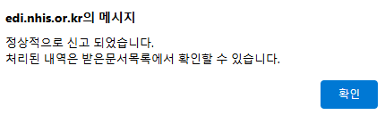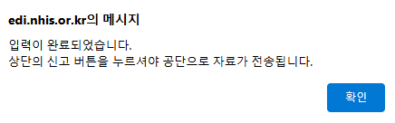 9. 입력이 완료되었습니다. 상단의 신고버튼을 누르셔야 공단으로 자료가 전송됩니다. 표시가 뜨면 확인을 눌러주세요.