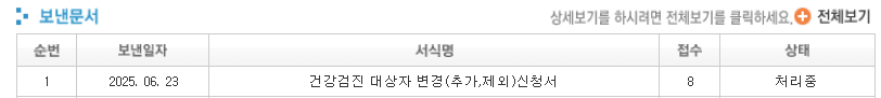 이제 다시 맨앞화면으로 돌아가면 건강검진 대상자 변경(추가,제외)신청서가 접수되어 있는것을 확인하실 수 있습니다.