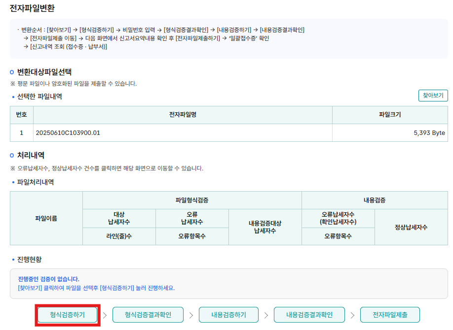 다음화면에서 전자파일 제출 전에 내용을 확인하시고 [전자파일 제출하기] 버튼을 눌러줍니다.