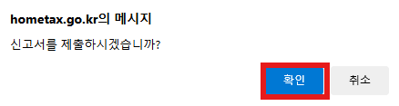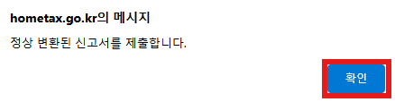 그러면 아래처럼 두번 알림창이 뜨고 확인 > 확인을 눌러주면 제출 완료 됩니다.