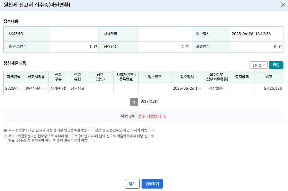 접수증 보기. 납부서 보기를 눌러 출력하세요. 원천세신고서를 보려면 접수번호를 클릭하면 볼 수 있습니다.