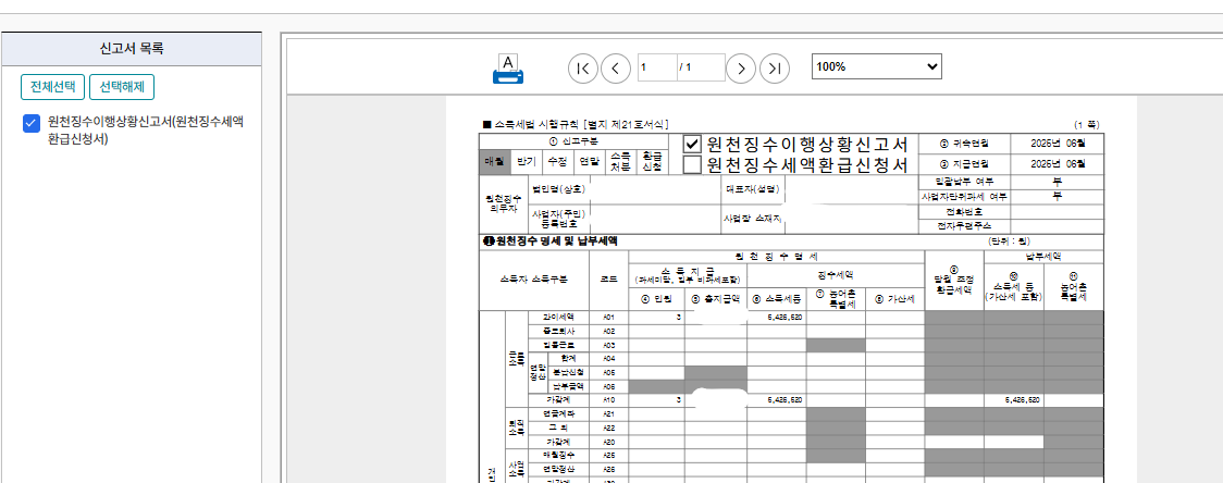하나하나 인쇄눌러주시면 됩니다. 이 사업장은 근로소득세 뿐이어서 근로소득세만 1건이 표시되었습니다.