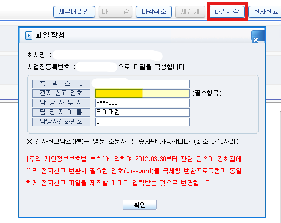 마감 후에 [파일제작]을 눌러서 홈택스에서 전자신고를 할 수 있도록 파일을 제작합니다.