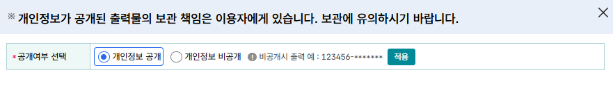 신고서 출력을 위해 접수번호를 누르면 아래처럼 개인정보공개를 할것인지 비공개를 할것인지 메세지 창이 뜹니다.