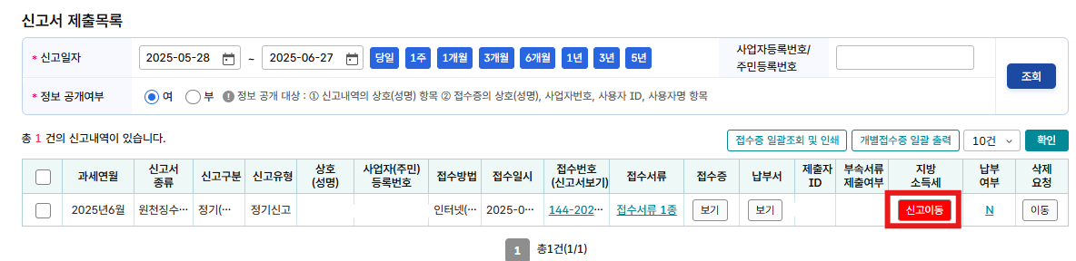 기본적으로는 비공개로 되어있지만 저는 개인정보 공개로 적용하고 신고서를 출력합니다.
