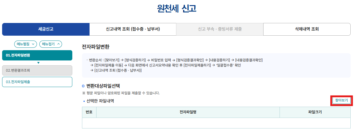 우리는 회계프로그램을 이용한 파일 변환신고를 할 거니까 [파일변환신고]를 눌러줍니다.