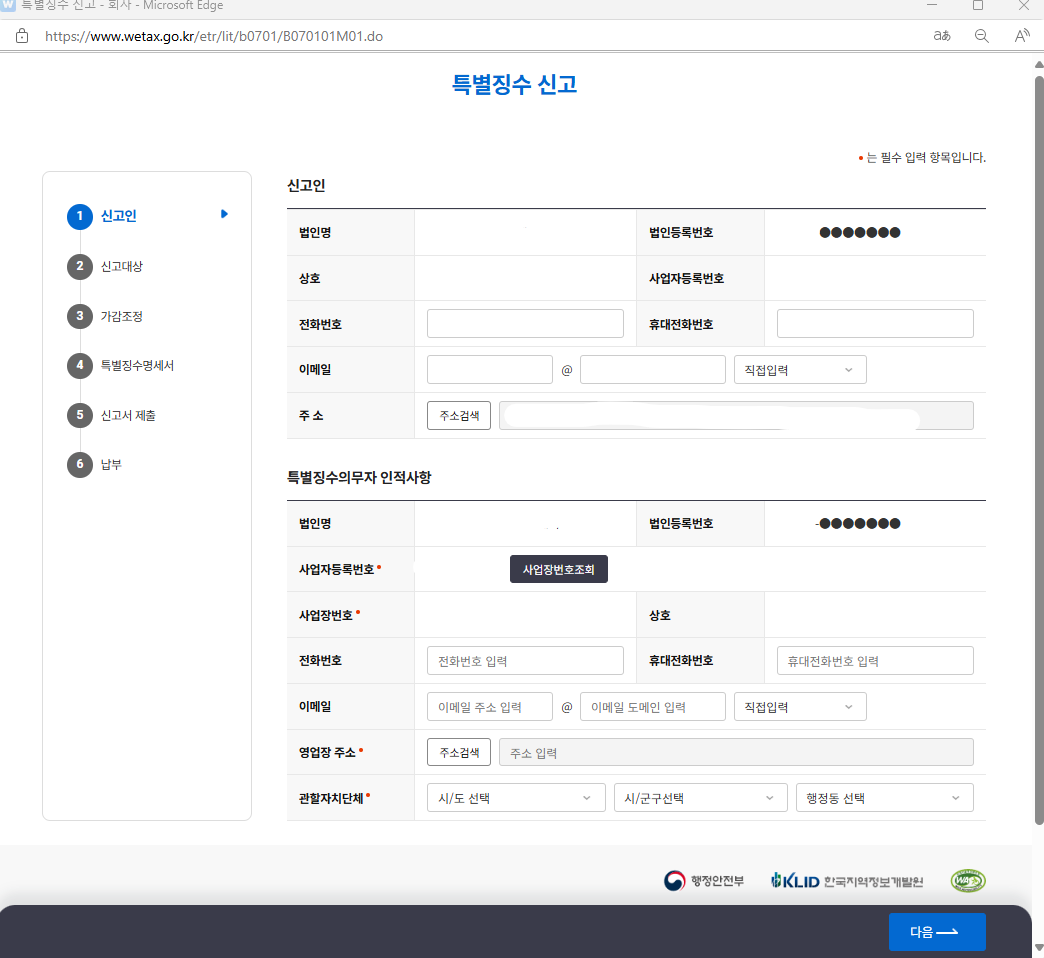 전화번호나 사업자등록번호 조회해서 주소 행정동 선택하고 다음으로 넘어갑니다.