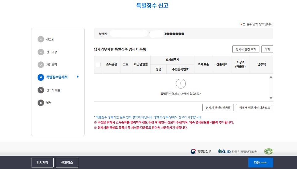 특별징수명세서도 딱히 뭐 할거 없으니 다음을 눌러줍니다.