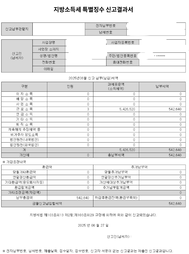 지방소득세 신고결과서를 출력하면 아래와 같은 형식이 뜹니다.