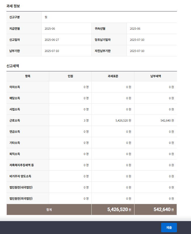 그리고 입력한 과세 정보 등을 확인하시고 [제출]을 누릅니다.