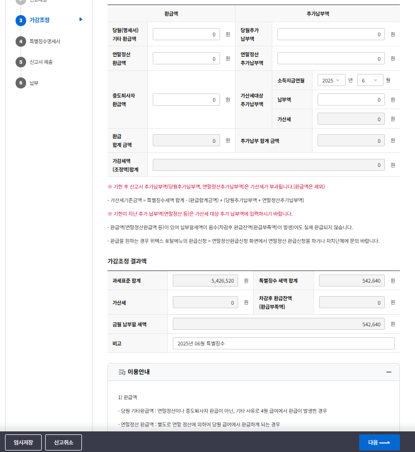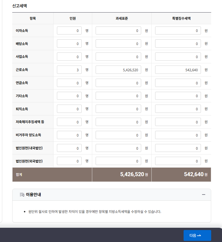 홈택스에 신고된 소득세 금액이 자동으로 입력되고, 특별징수세액은 소득세의 10%로 자동반영이 되기 때문에