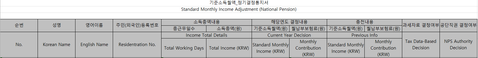 | No. | Korean Name | English Name | Residentration No. | Income Total Details | Current Year Decision | Previous Info | Tax Data-Based Decision | NPS Authority Decision | |||