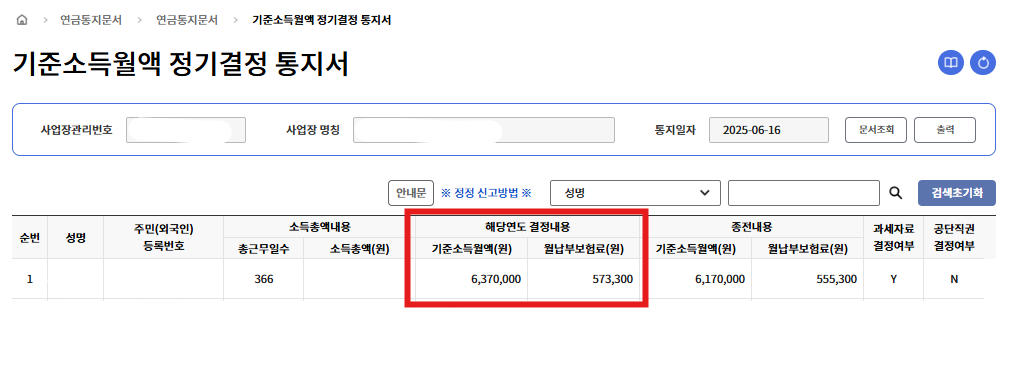 그러면 6월 16일쯤에 기준소득월액 정기결정 통지서(2025.06월)이 와있는 것을 볼 수 있을 것입니다.