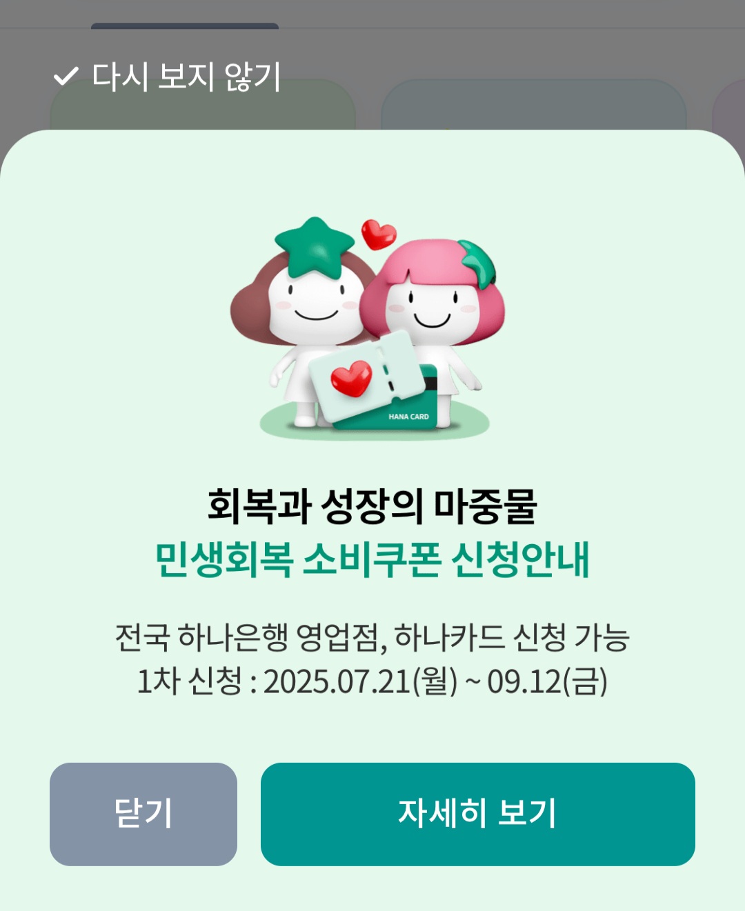 하나은행 어플에 로그인하면 아래와 같이 로그인하자마자 민생회복 소비쿠폰 신청안내 팝업창이 뜹니다.