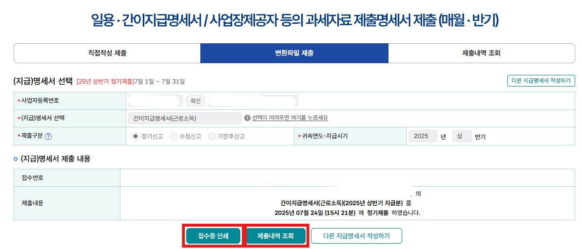 [소득구분 : 근로소득, 지급분기 : 상반기] 를 선택하면 제출연월일은 2025/07/31일로 자동으로 변경됩니다.