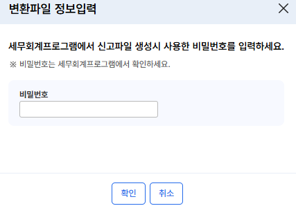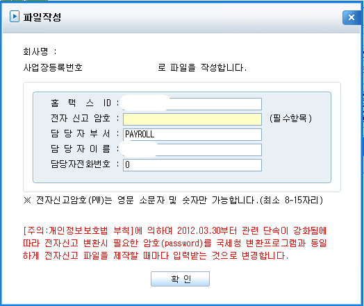 7. 전자파일 작성 팝업이 뜨고 홈택스 아이디, 전자신고 암호 (최소 8~15자리)를 입력하고 확인을 눌러 파일제작을 합니다.