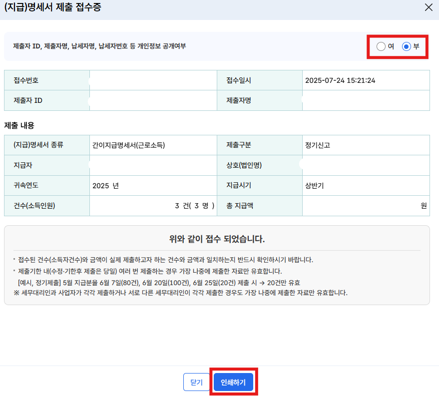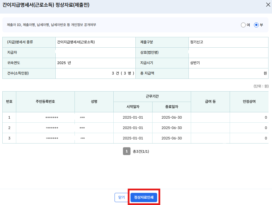 그러므로 개인별 내역을 확인하고 싶다면 제출 전 정상자료 인쇄를 하여 저장해두시기 바랍니다.