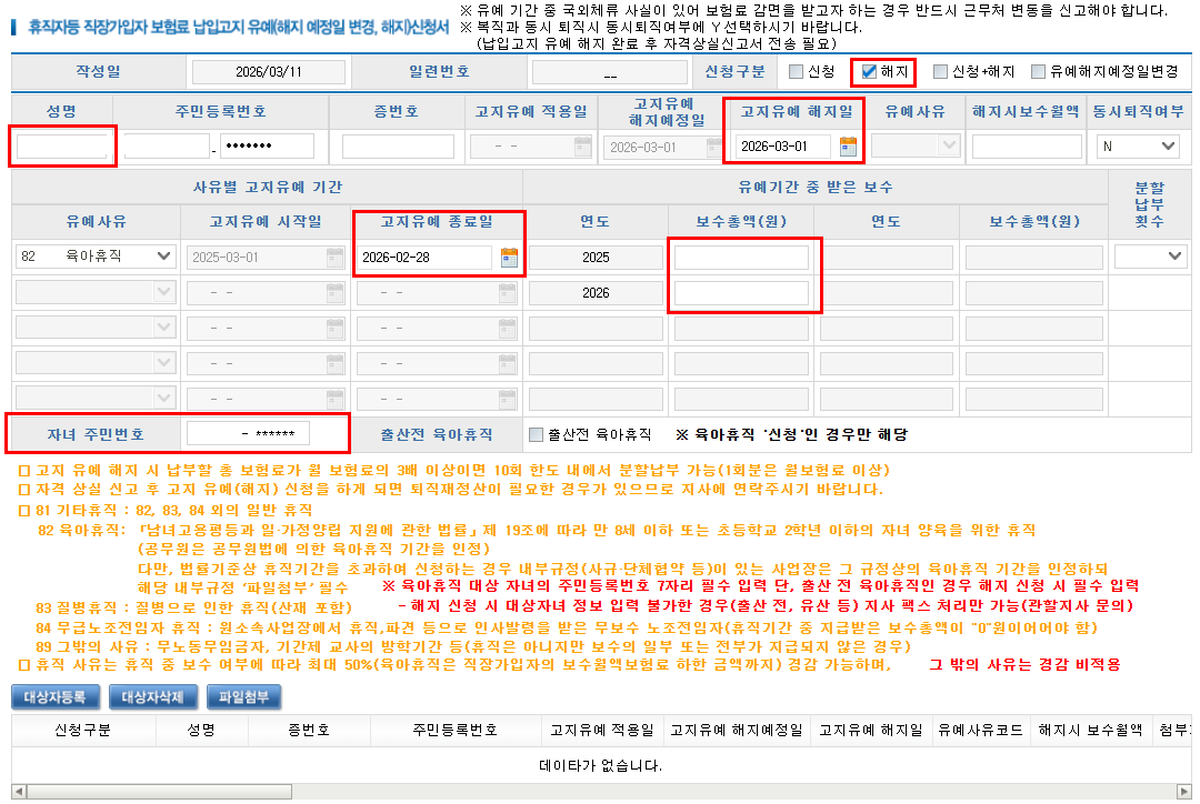 * 고지 유예 해지일 : 휴가가 종료되는 날의 다음날 (복직일)