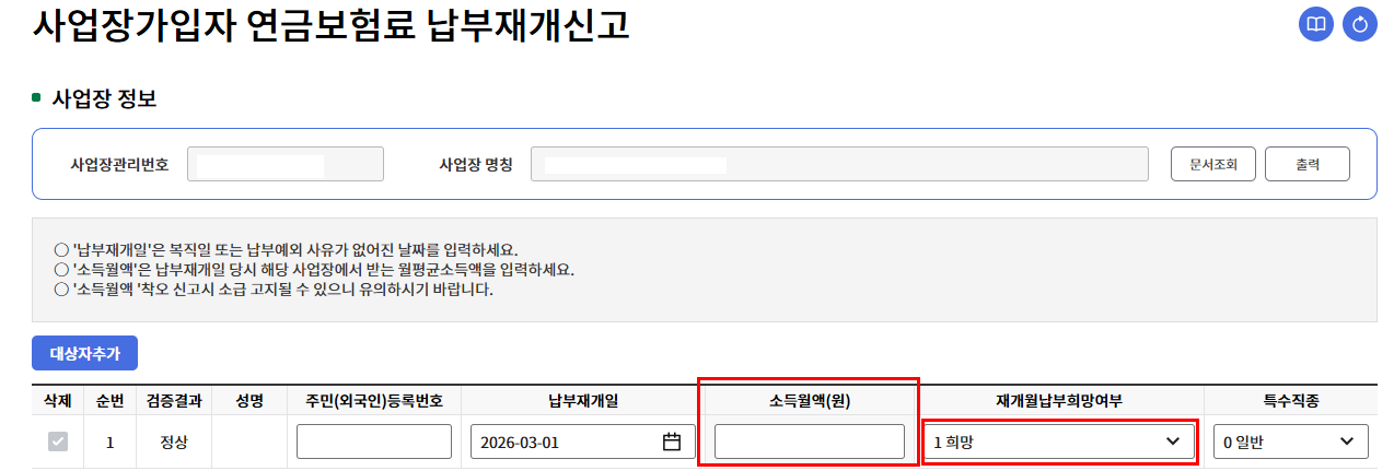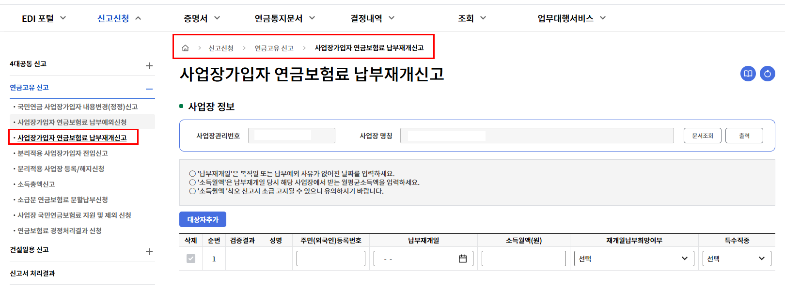 로그인-> 신고신청 -> 연금고유 신고-> 사업장가입자 연금보험료 납부재개신고