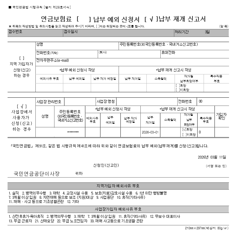 납부재개신고는 연금 고유 신고이므로 건강보험과 별개로 따로 해주어야 합니다.