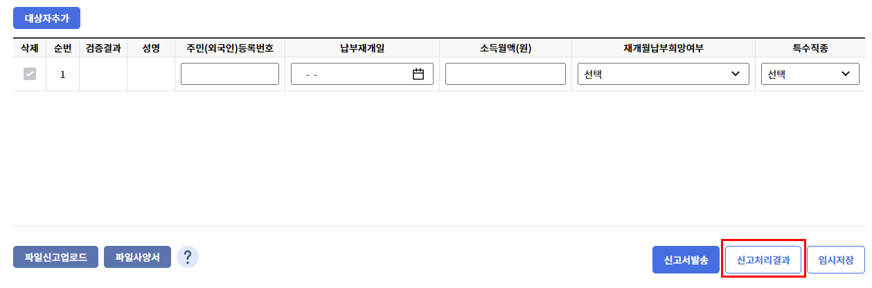 [대상자 등록] 후 [신고(전송)/신청] 버튼을 누르면 신고 완료됩니다.