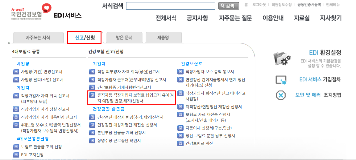 2. 공동인증서 로그인-> 신고/신청-> 휴직자 등 직장 가입자 보험료 납입고지 유예(해지 예정일 변경, 해지) 신청서