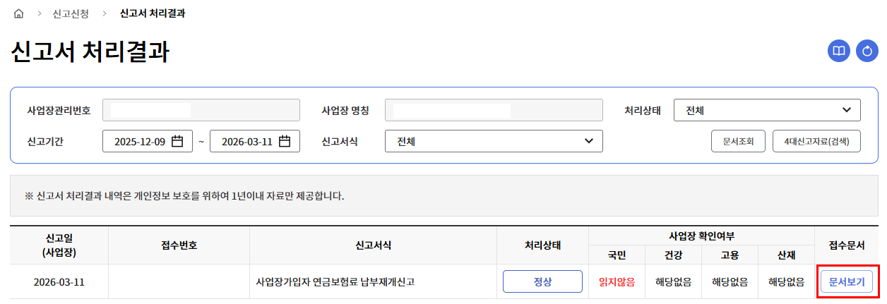 문서보기를 클릭하면 신고된 납부재개신고서를 출력할 수 있습니다.