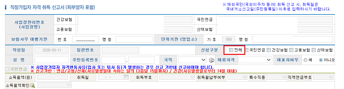신청구분에서 전체에 체크하시면 자동으로 국민연금, 건강보험, 고용보험, 산재보험에 체크가 됩니다.