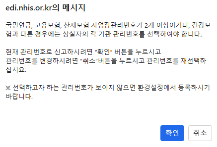 그러면 또 메세지 창이 뜨면서 사업장관리번호를 확인하라고 합니다.