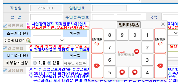 주민번호 뒷자리 입력시에는 이렇게 마우스로 입력할 수 있는 숫자키가 형성됩니다.