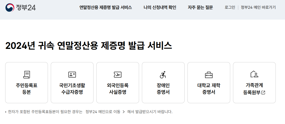 연말정산 시즌이다보니 정부 24에도 연말정산용 제증명 발급 서비스가 제일 첫페이지에 올라와 있습니다.