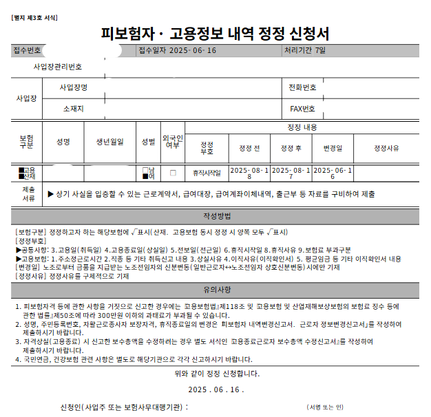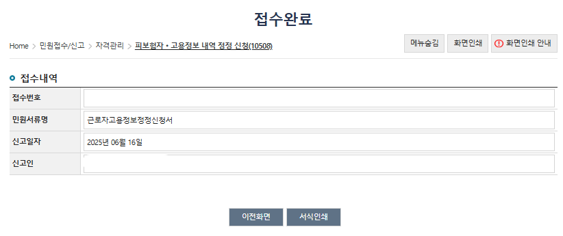 접수완료 화면에서 서식 인쇄를 눌러주면 근로자 고용정보 정정신청서가 출력됩니다.