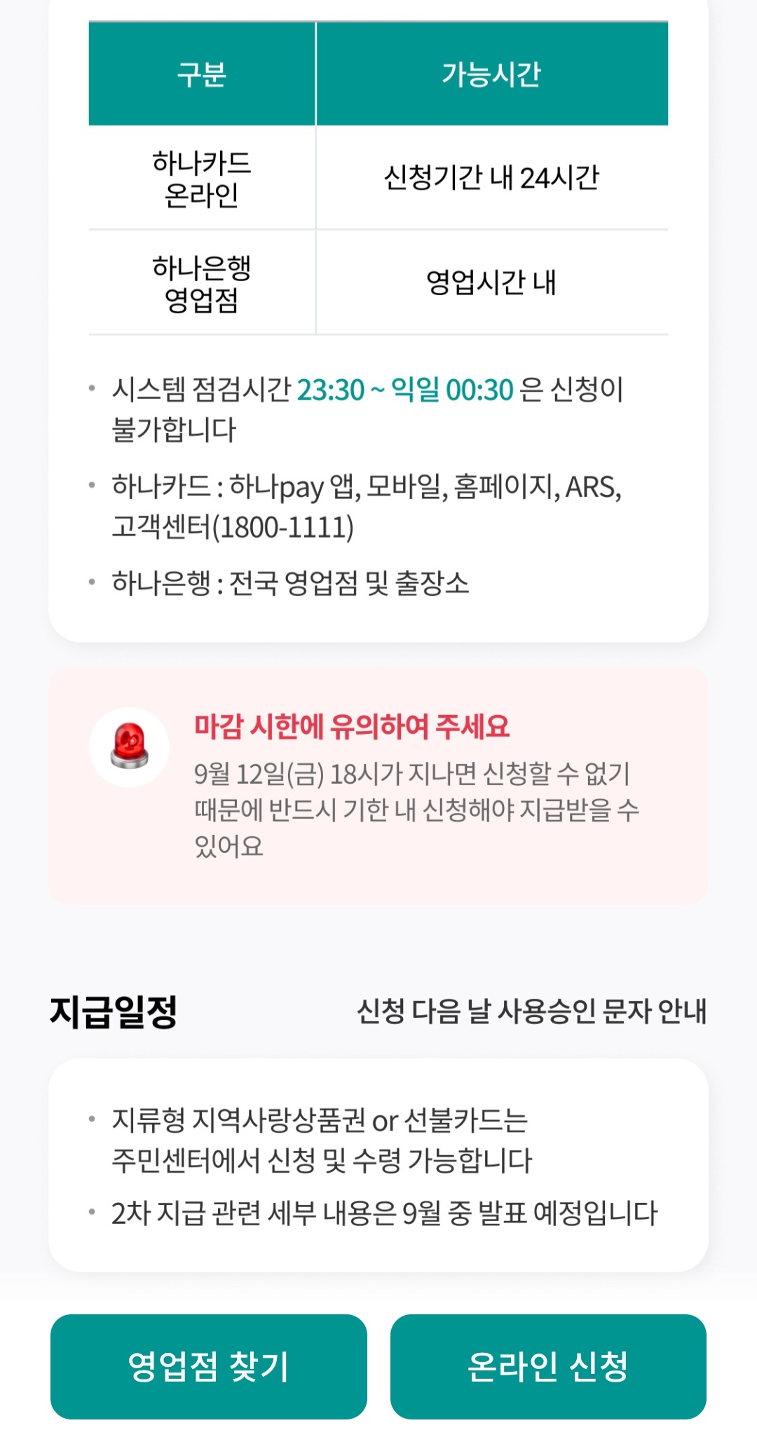 그리고 저는 온누리 상품권도 이용중이라서 온누리상품권에 등록해둔 카드도 하나카드이기 때문에 하나은행에서 신청하였습니다.